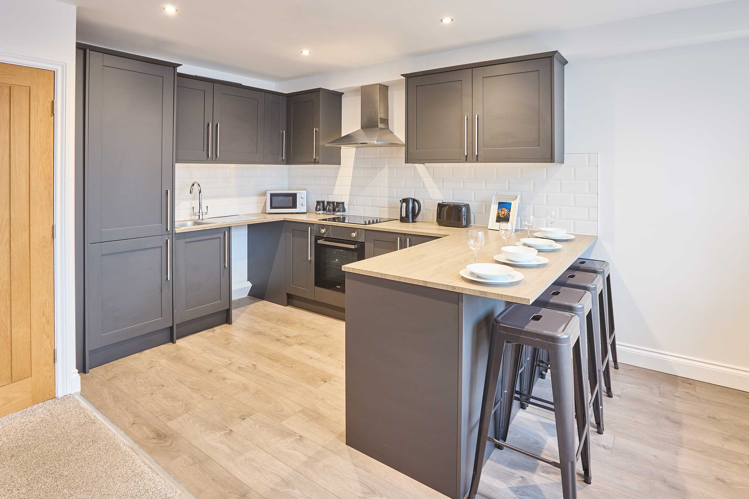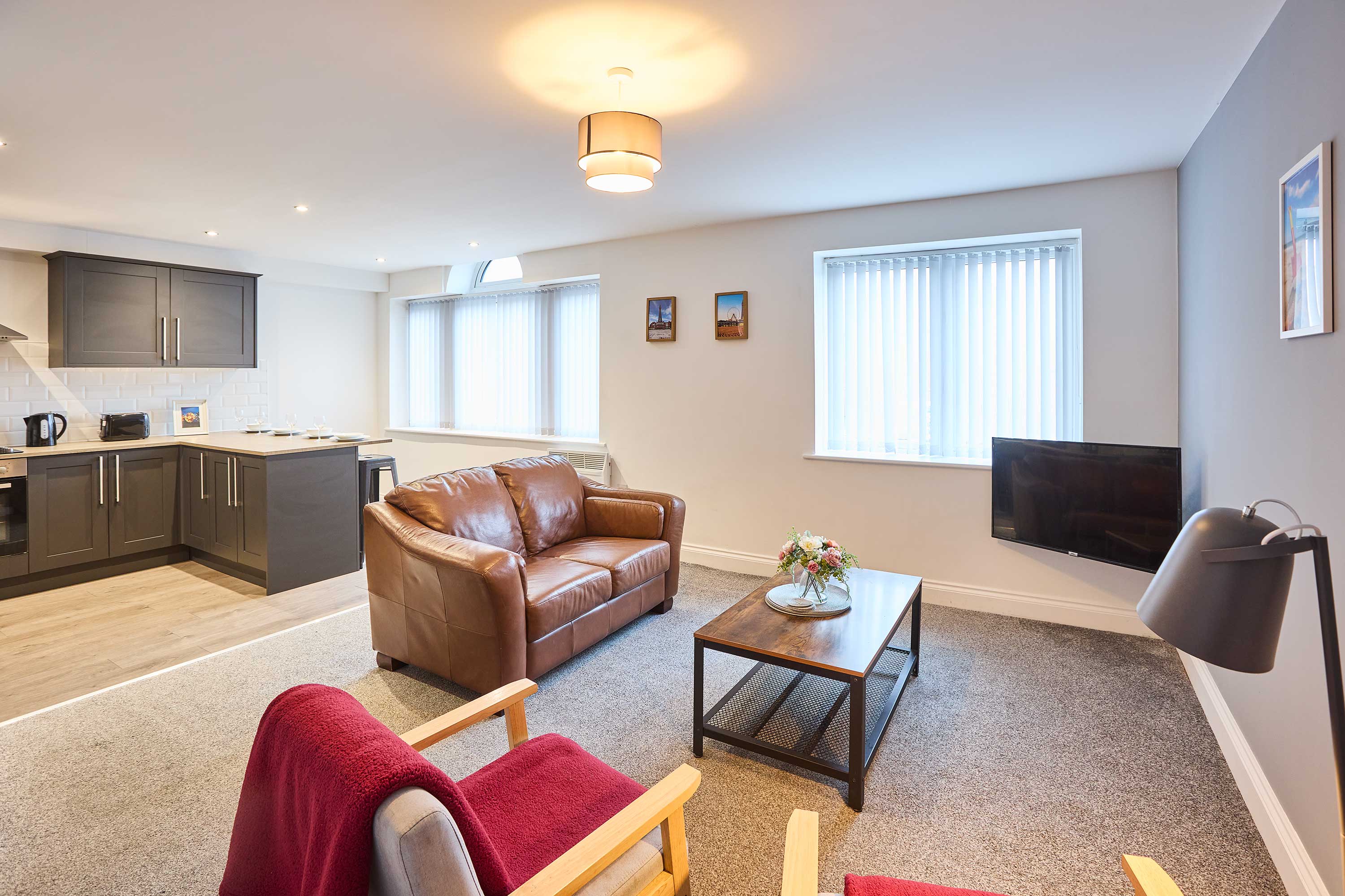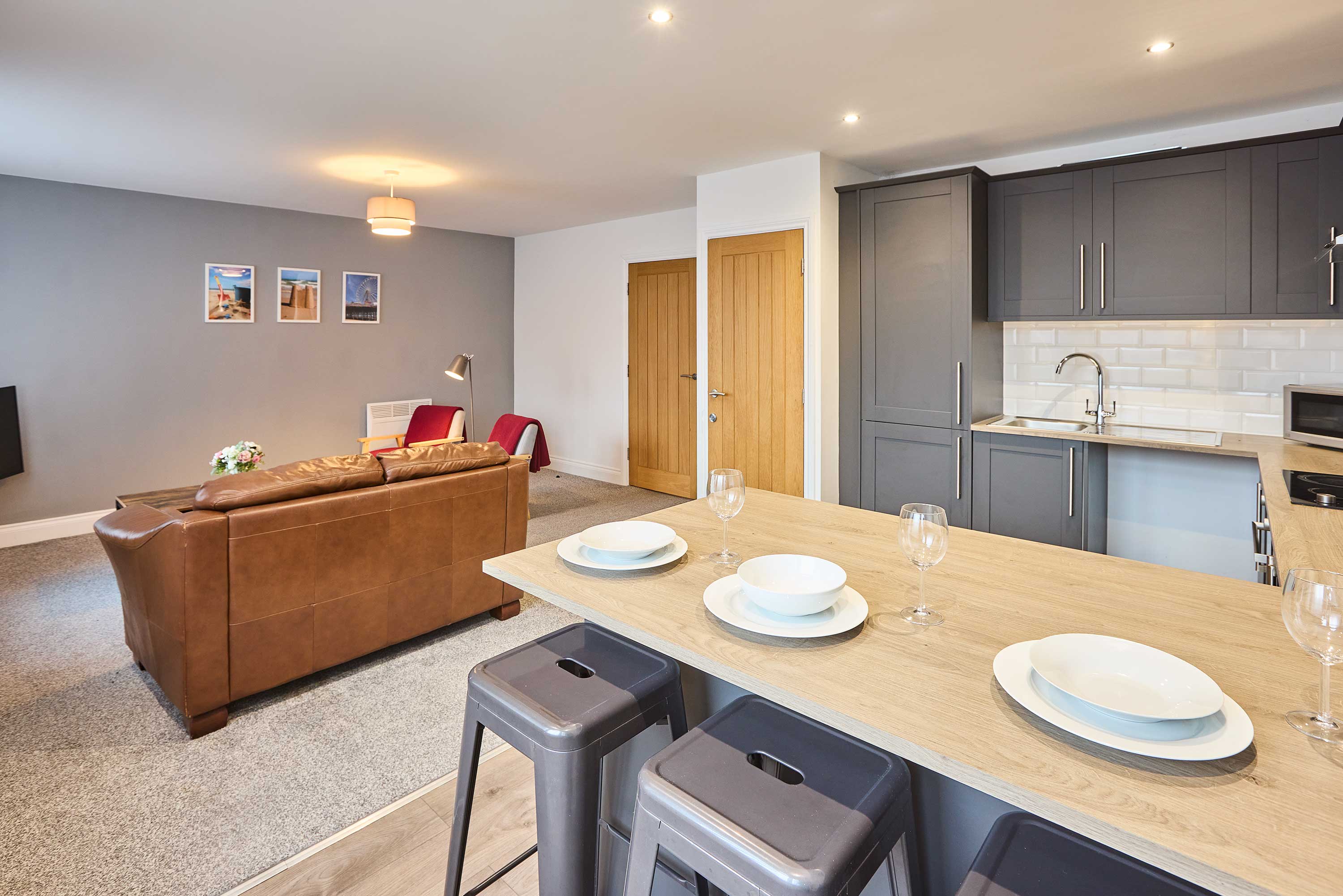 This stylish holiday apartment features a spacious open-plan kitchen and living area, designed for comfort and relaxation. The living space offers comfortable seating and a flat-screen TV, perfect for unwinding after a day out, while large windows flood the apartment with natural light, creating a bright and welcoming atmosphere. The modern, well-equipped kitchen is both practical and stylish, complete with a breakfast bar that provides additional seating for casual dining or morning coffee. The apartment includes two generously sized double bedrooms, each thoughtfully furnished for a restful stay. Both rooms offer ample storage and a dressing table, combining comfort with convenience. A large, contemporary bathroom completes the space, featuring both a bath and a separate shower—ideal for relaxing or refreshing at the end of the day.