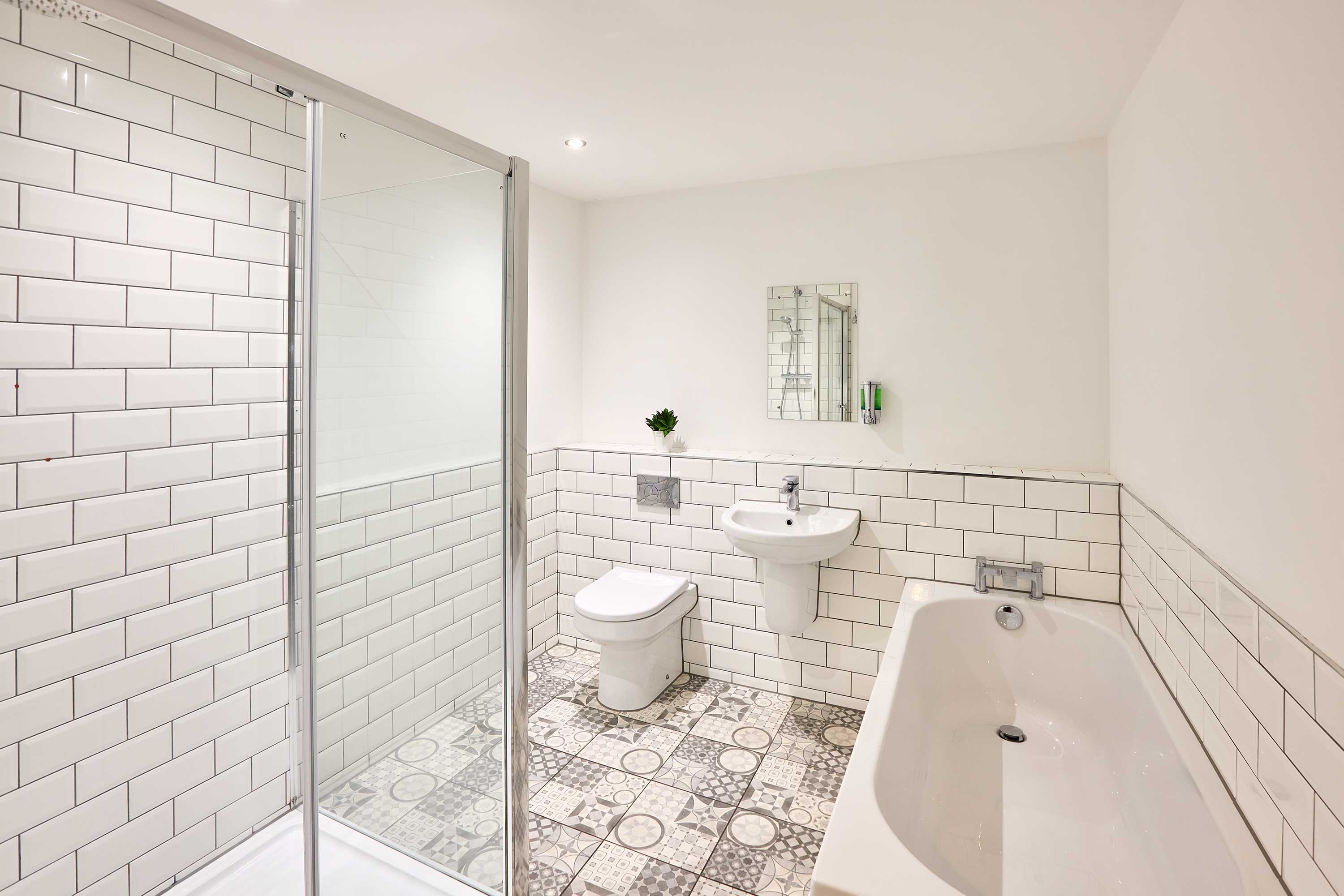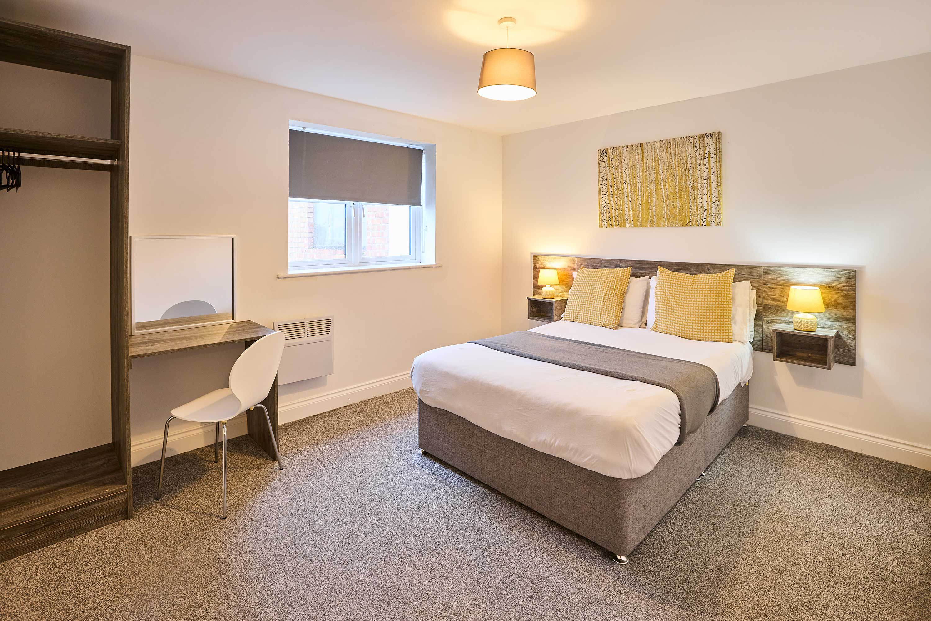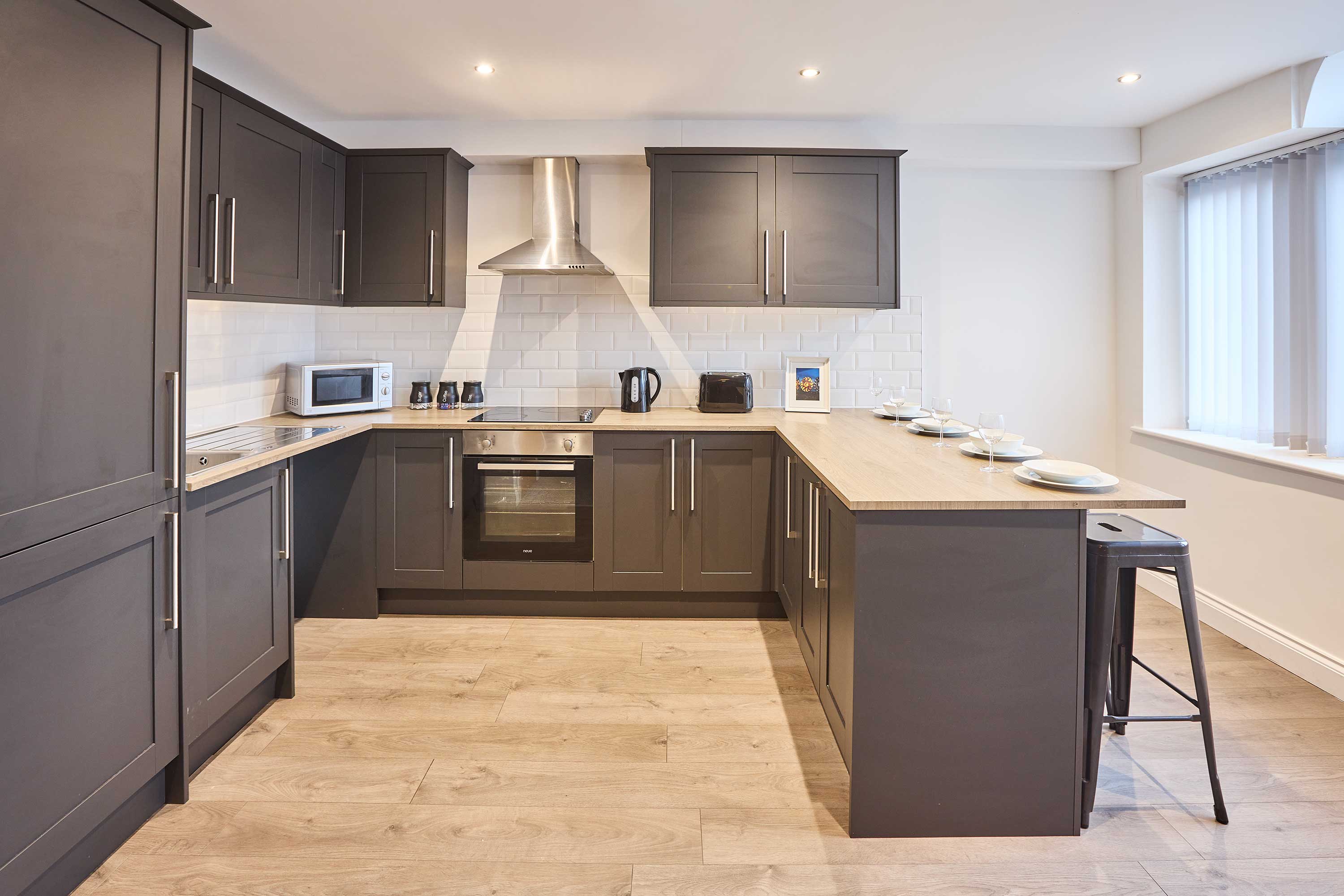 This stylish holiday apartment features a spacious open-plan kitchen and living area, designed for comfort and relaxation. The living space offers comfortable seating and a flat-screen TV, perfect for unwinding after a day out, while large windows flood the apartment with natural light, creating a bright and welcoming atmosphere. The modern, well-equipped kitchen is both practical and stylish, complete with a breakfast bar that provides additional seating for casual dining or morning coffee. The apartment includes two generously sized double bedrooms, each thoughtfully furnished for a restful stay. Both rooms offer ample storage and a dressing table, combining comfort with convenience. A large, contemporary bathroom completes the space, featuring both a bath and a separate shower—ideal for relaxing or refreshing at the end of the day.
