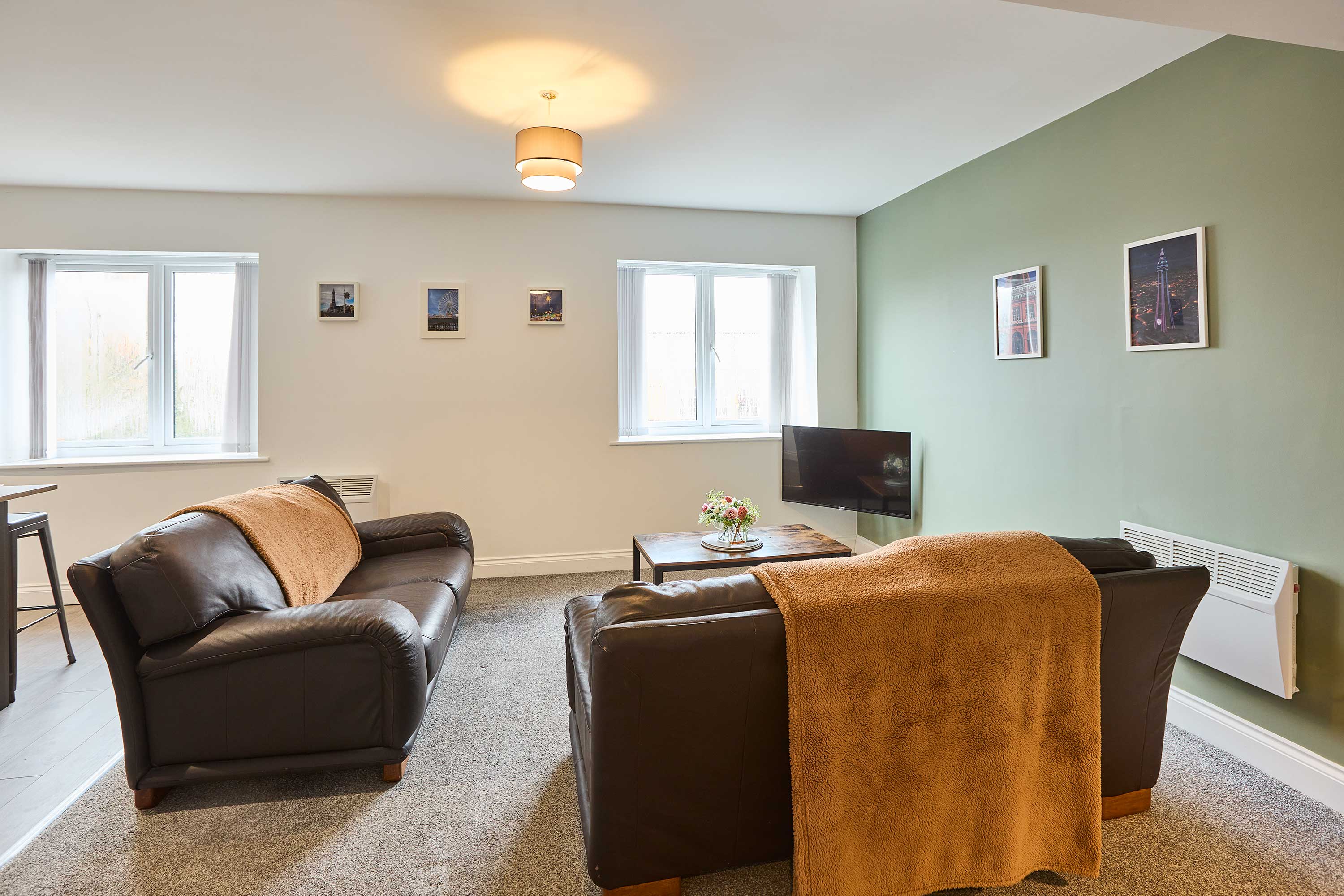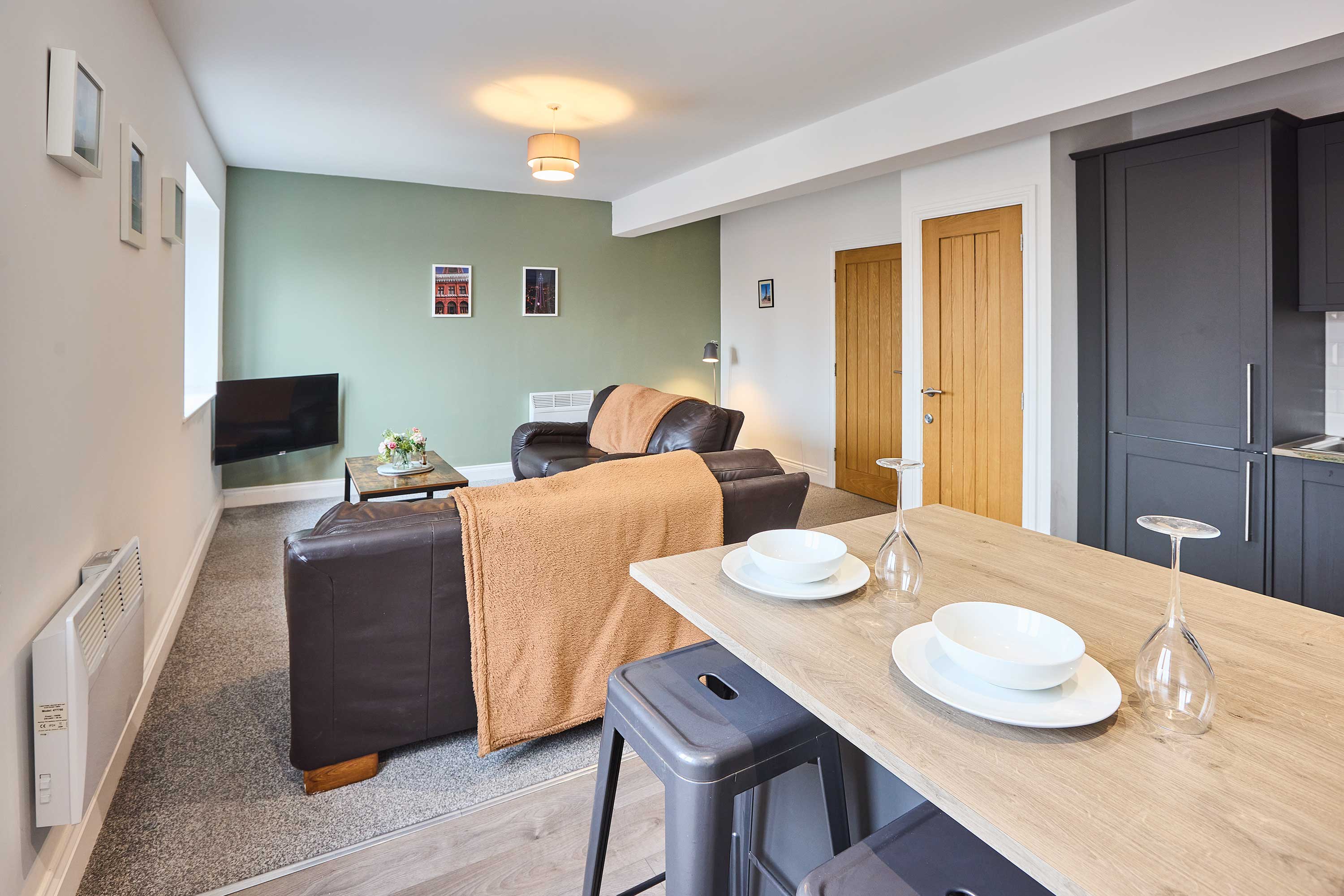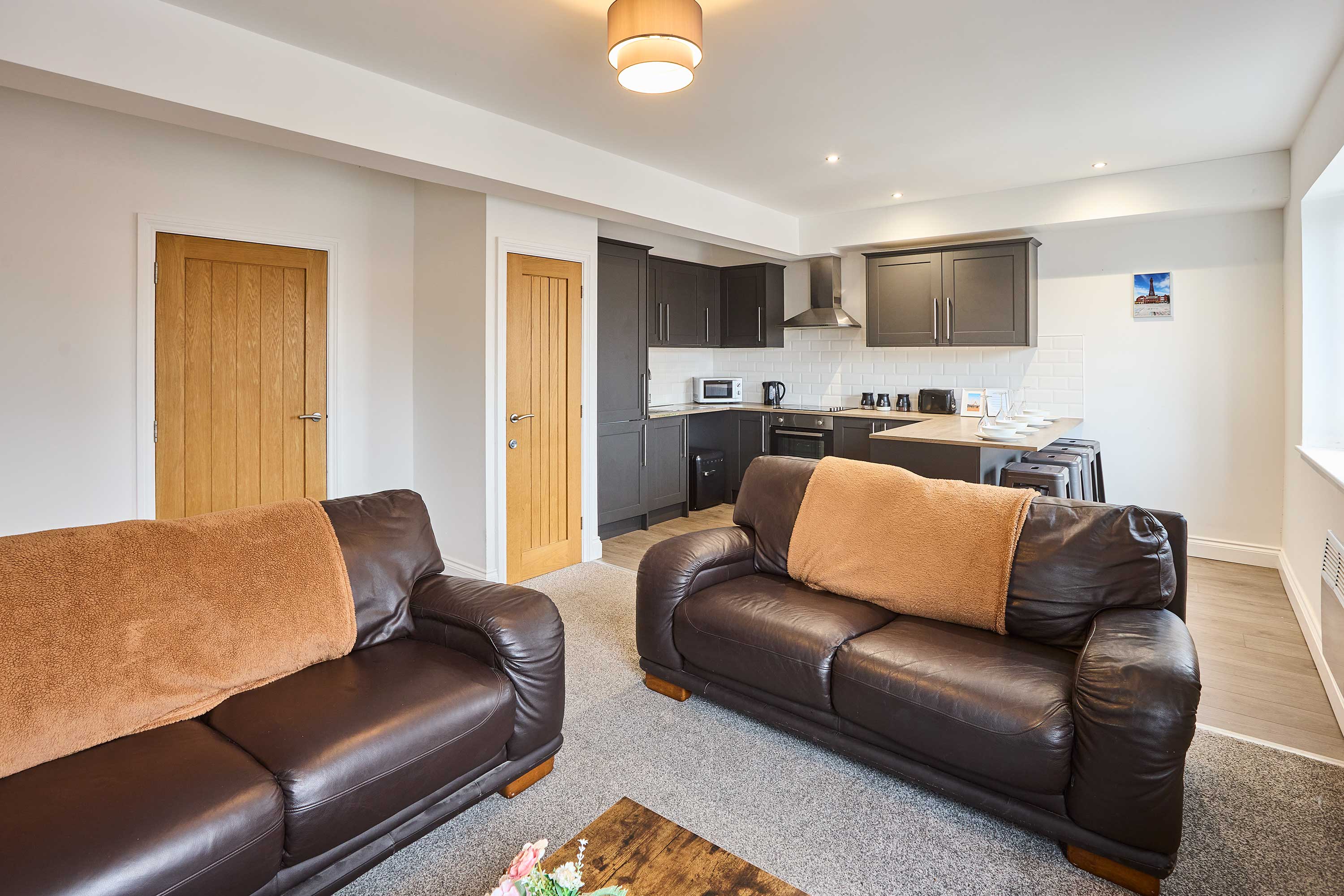 Enjoy a stylish stay in this modern open-plan apartment, perfectly situated in the heart of Blackpool. The sleek kitchen comes fully equipped with all amenities and features a breakfast bar, ideal for casual dining or morning coffee. The living area is bright and inviting, with large windows, comfortable seating, and a TV for relaxing evenings. The apartment offers two spacious double bedrooms, ideal for families or friends, and a large bathroom complete with both a shower and a bath for ultimate relaxation. Located just minutes from Blackpool’s iconic seafront, piers, entertainment venues, shops, and restaurants, this apartment puts the best of the town on your doorstep. With easy access to trams and trains, you can explore the wider Lancashire coast with ease. This contemporary apartment combines comfort, convenience, and style—making it the perfect base for your Blackpool getaway.