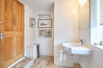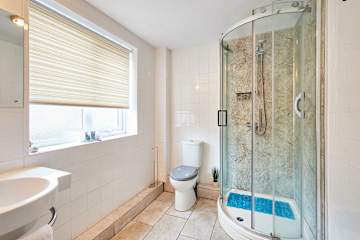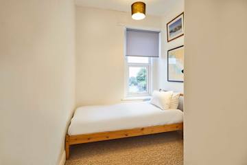 Upstairs, the main bedroom offers a stylish double bed, while the second bedroom provides a cosy single, making the property ideal for couples, friends, or small families. The contemporary bathroom, with underfloor heating and a glass-enclosed power shower, adds a touch of everyday luxury.