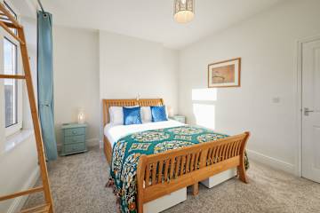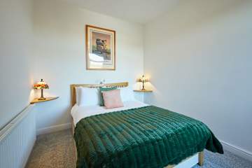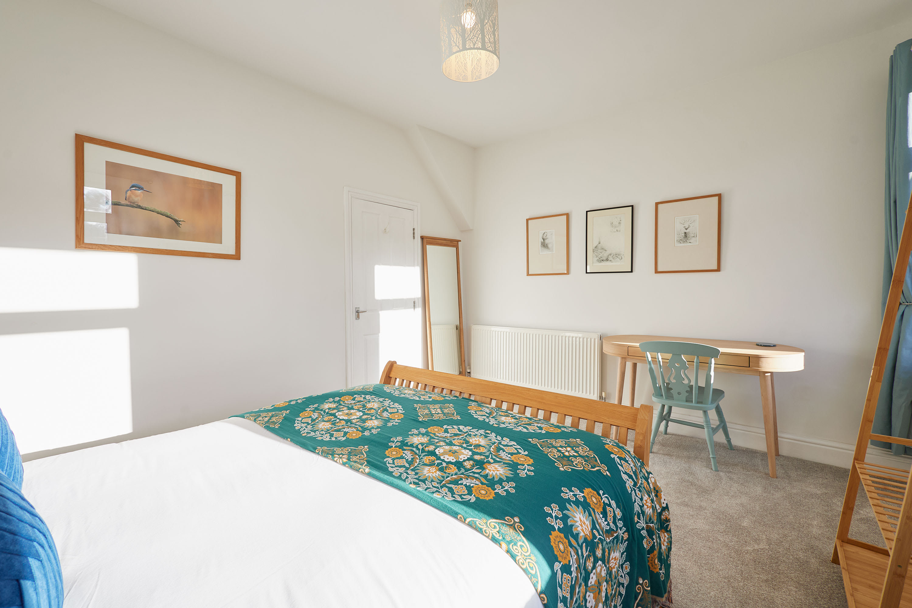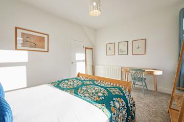 Head upstairs to the first floor where two beautiful bedrooms await. The master bedroom boasts a king-size bed dressed in crisp white linens, colourful soft furnishings and thoughtful touches to ensure restful nights.