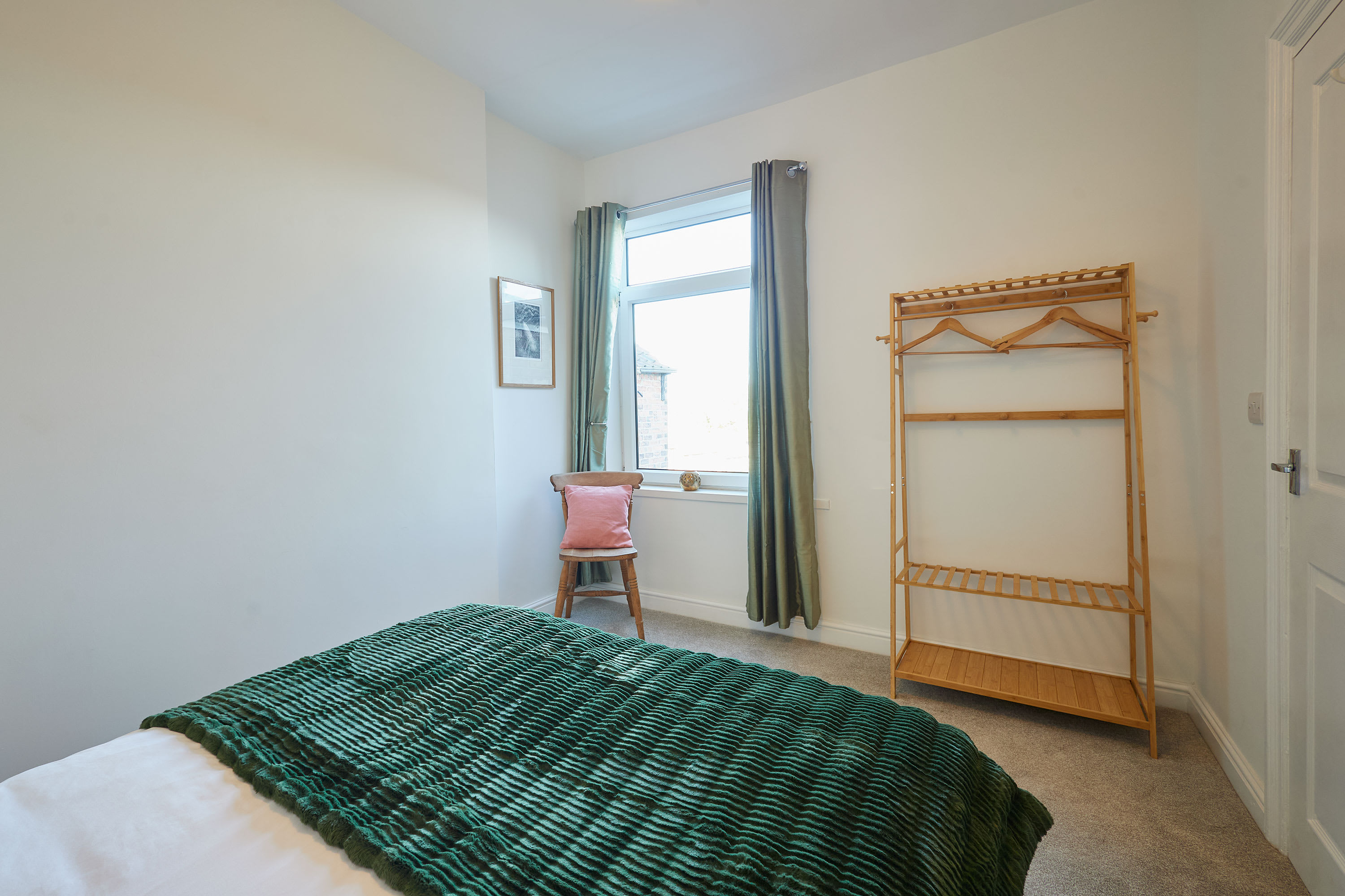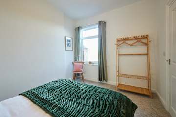 The second bedroom, with its high ceilings and double bed, offers a warm and inviting space for couples or solo travellers.