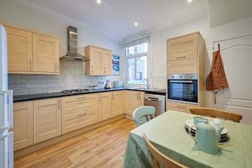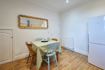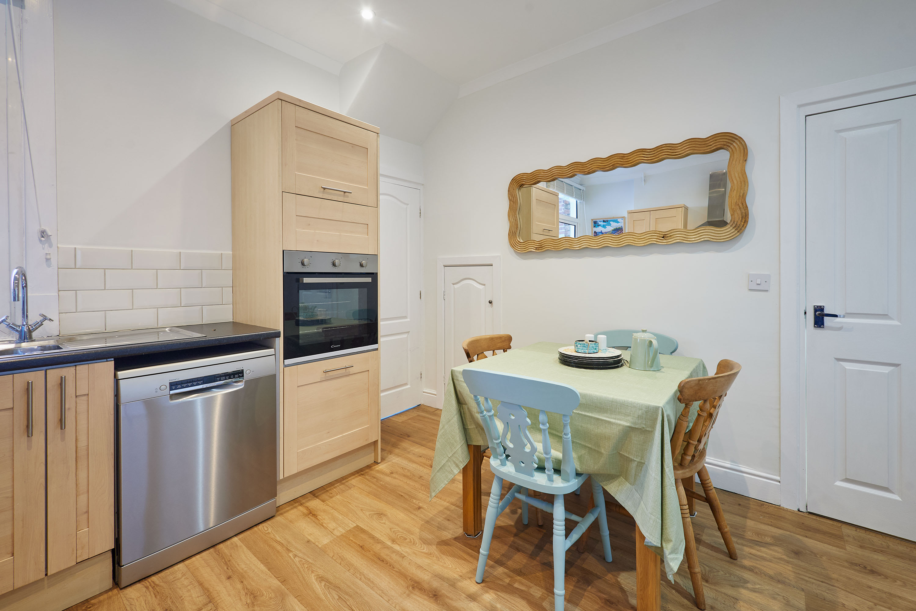 The open plan kitchen and dining area seamlessly blends modern convenience with traditional charm. With sleek wooden cabinets, black speckled worktops and all the appliances you could need for a self-catered stay, it’s the perfect setting for cooking and sharing delicious meals. Gather around the wooden dining table to entertain, chat and enjoy quality time together.