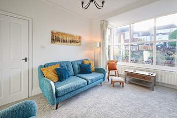 On the ground floor, the living room provides a cosy haven to curl up and relax. Sink into the sofa and enjoy a movie night on the flat screen Sky Ultimate TV, framed by soft hues of blue and yellow and filled with natural light from the large window.