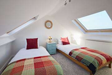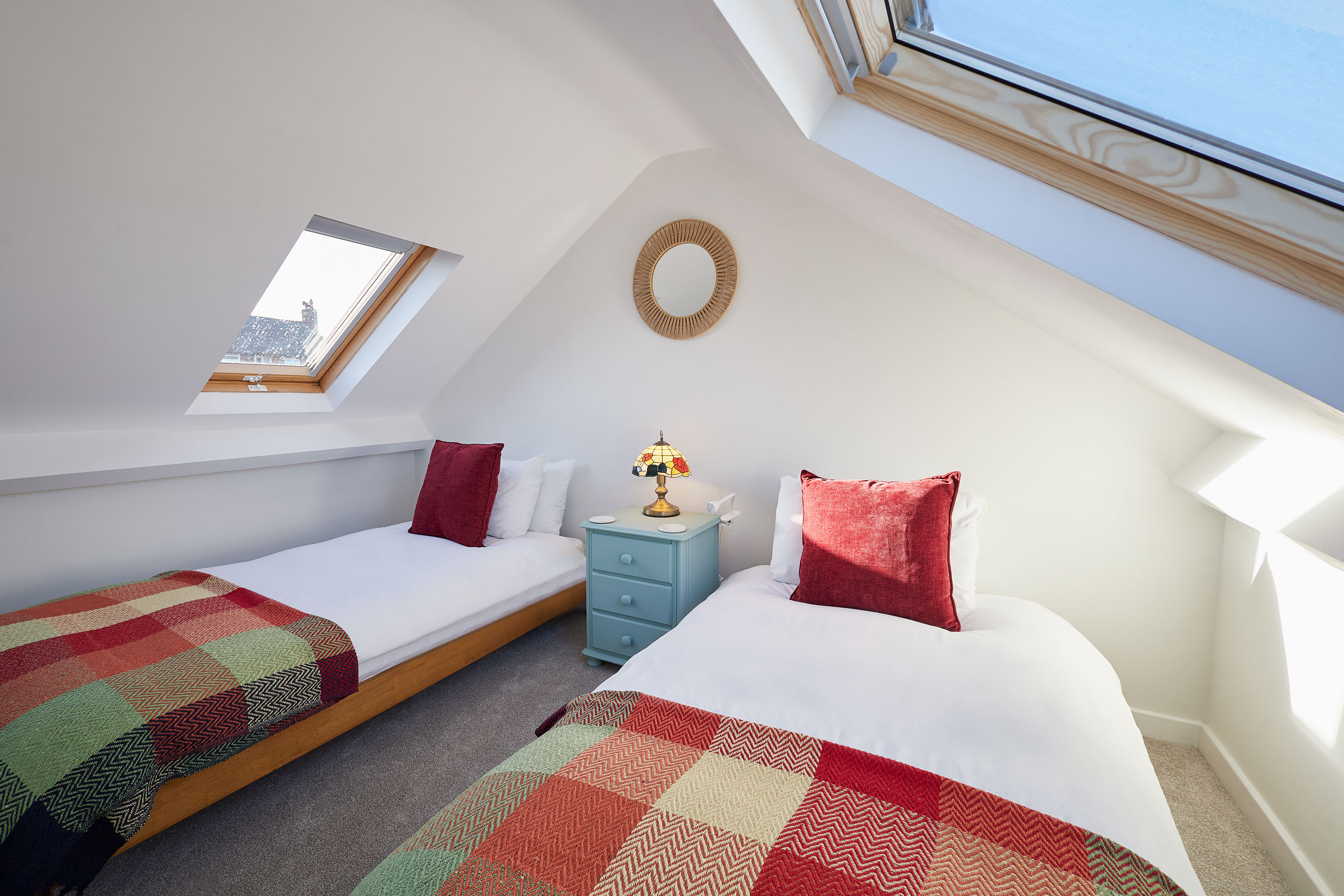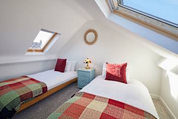 Venture to the top floor and discover the cosy third bedroom - a delightful space with twin beds, a sloped ceiling and charming accessories, ideal for both children and adults.