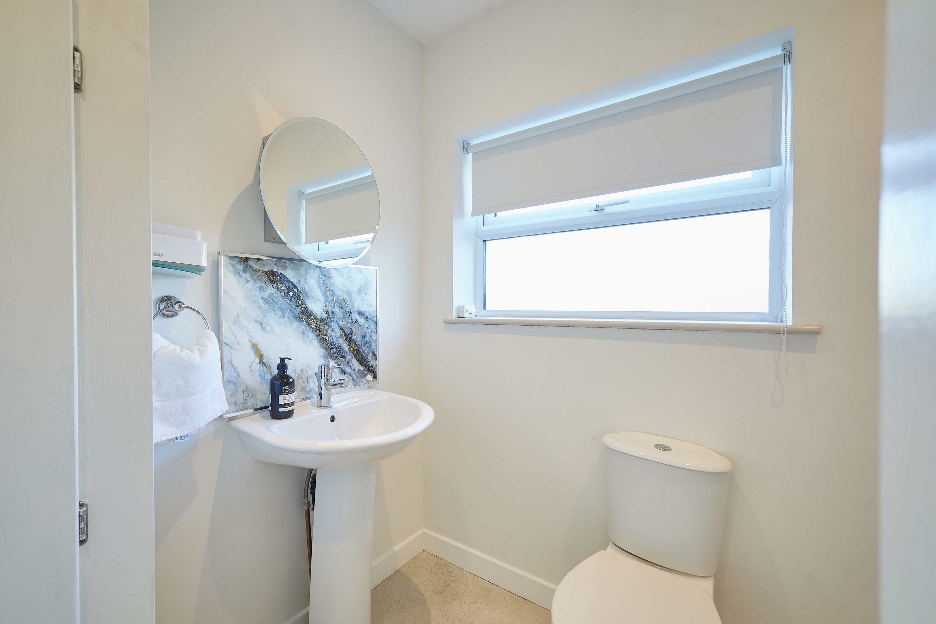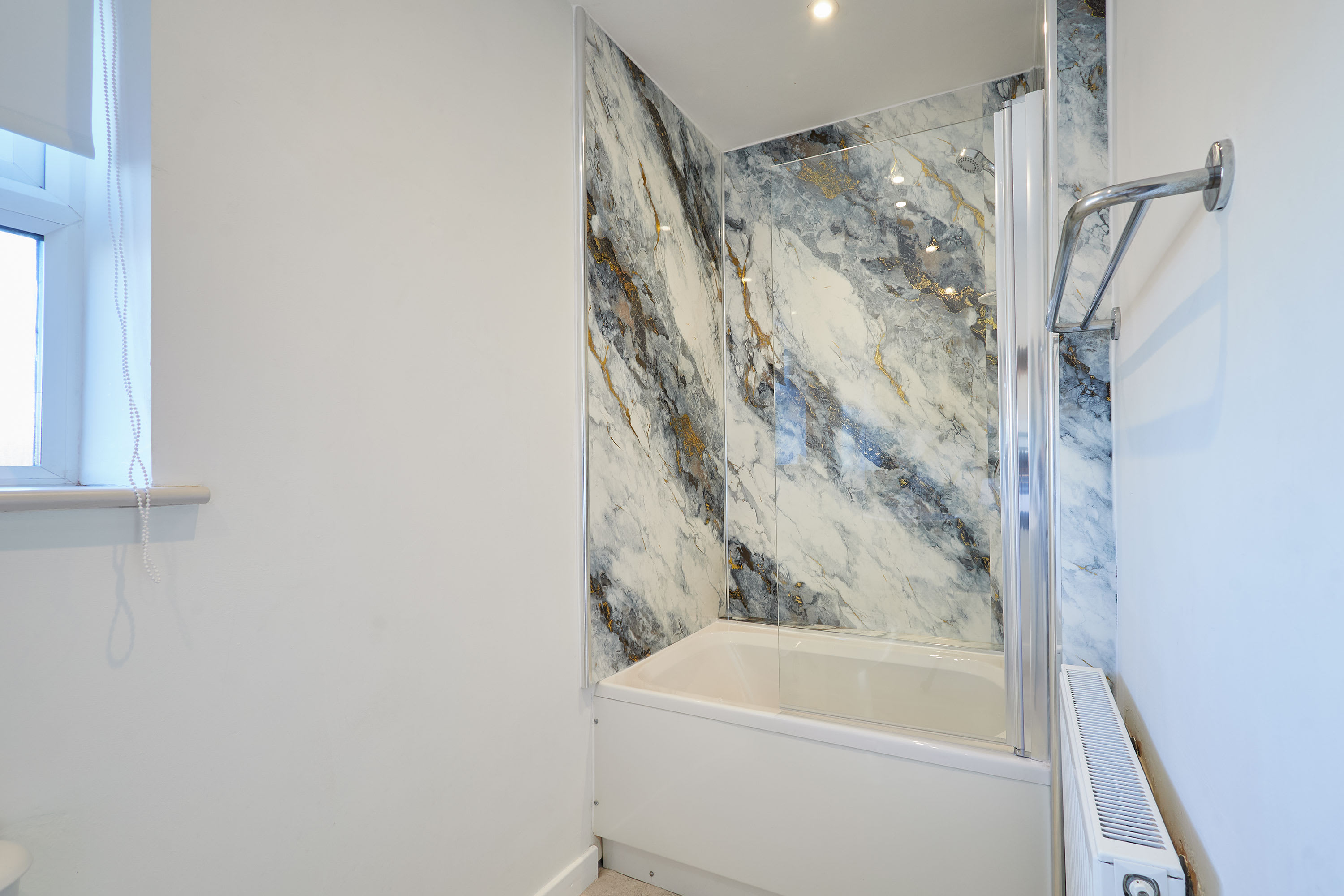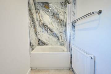 The family bathroom on this floor features a bath with an overhead shower, marble-effect tiles and everything you need to refresh and unwind.