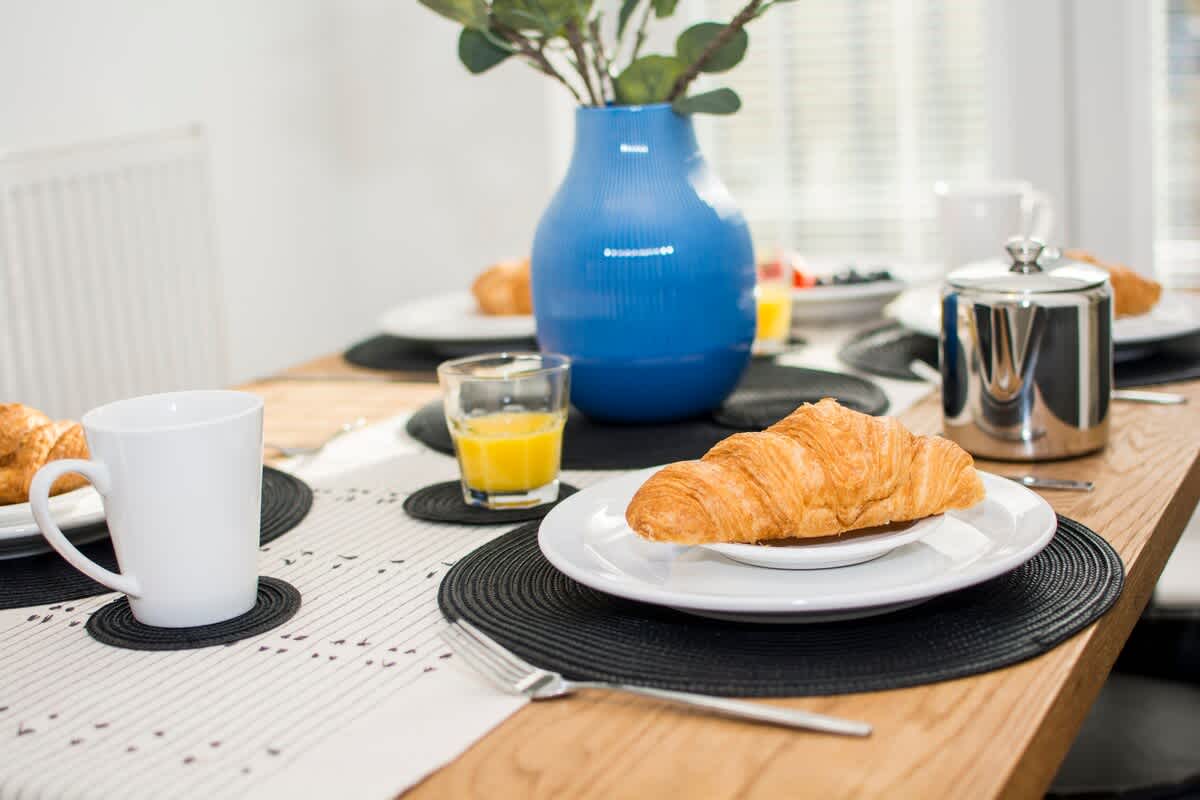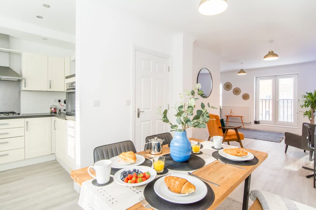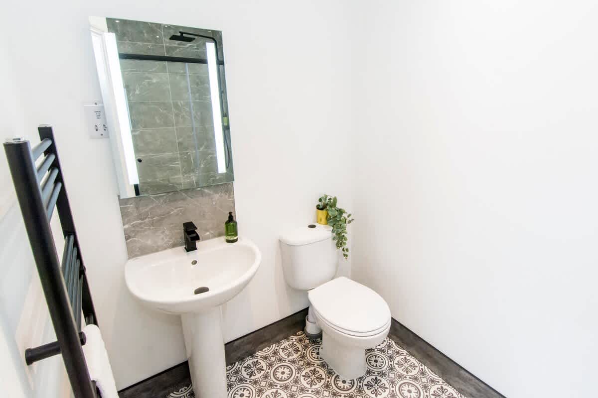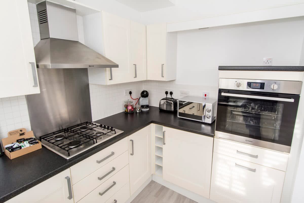 Enjoy a range of convenient amenities during your stay, including free private and on-street parking. Each bedroom is equipped with its own separate bathroom for added privacy and comfort. Benefit from 24/7 self check-in service, and stay connected with free WiFi. All bed linen and towels are provided, along with a hairdryer and toiletries. The fully equipped kitchen includes a fridge freezer, washing machine, toaster, microwave, kettle, cutlery, cookware, cooking utensils, and a coffee machine. The dining area features a table and chairs for your meals. Additional amenities include an iron and ironing board, a large 65” Smart TV with Netflix included, and a peaceful neighbourhood close to all main amenities.