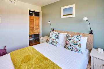 Upstairs, you’ll find three inviting bedrooms. The master bedroom boasts a king-size bed and ensuite bathroom with a walk-in shower, while the second offers a comfortable double bed. The third bedroom features a small double, making it a cosy haven for either one or two guests.