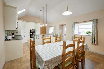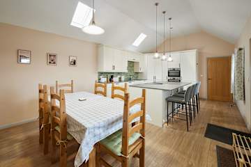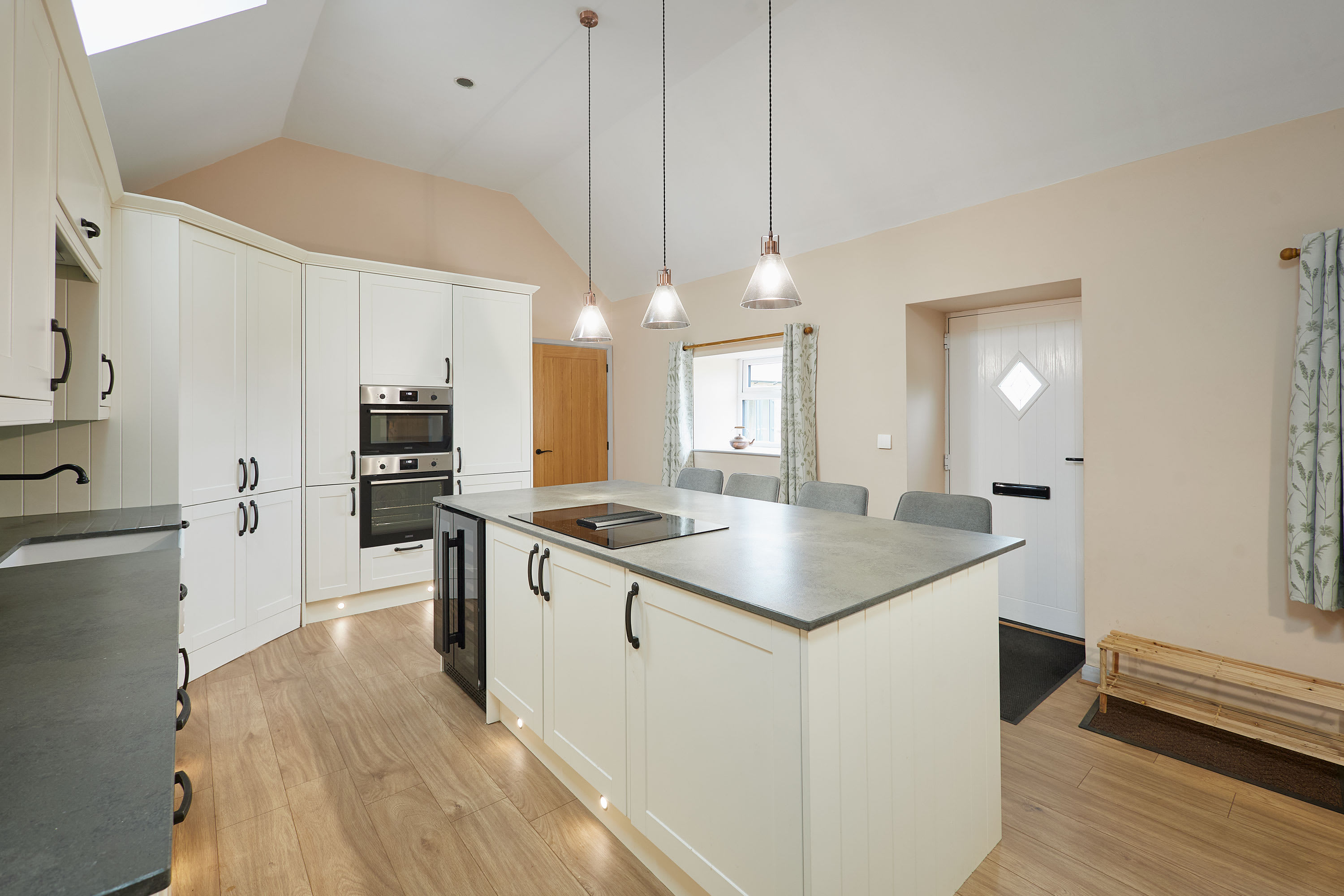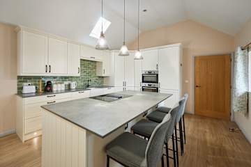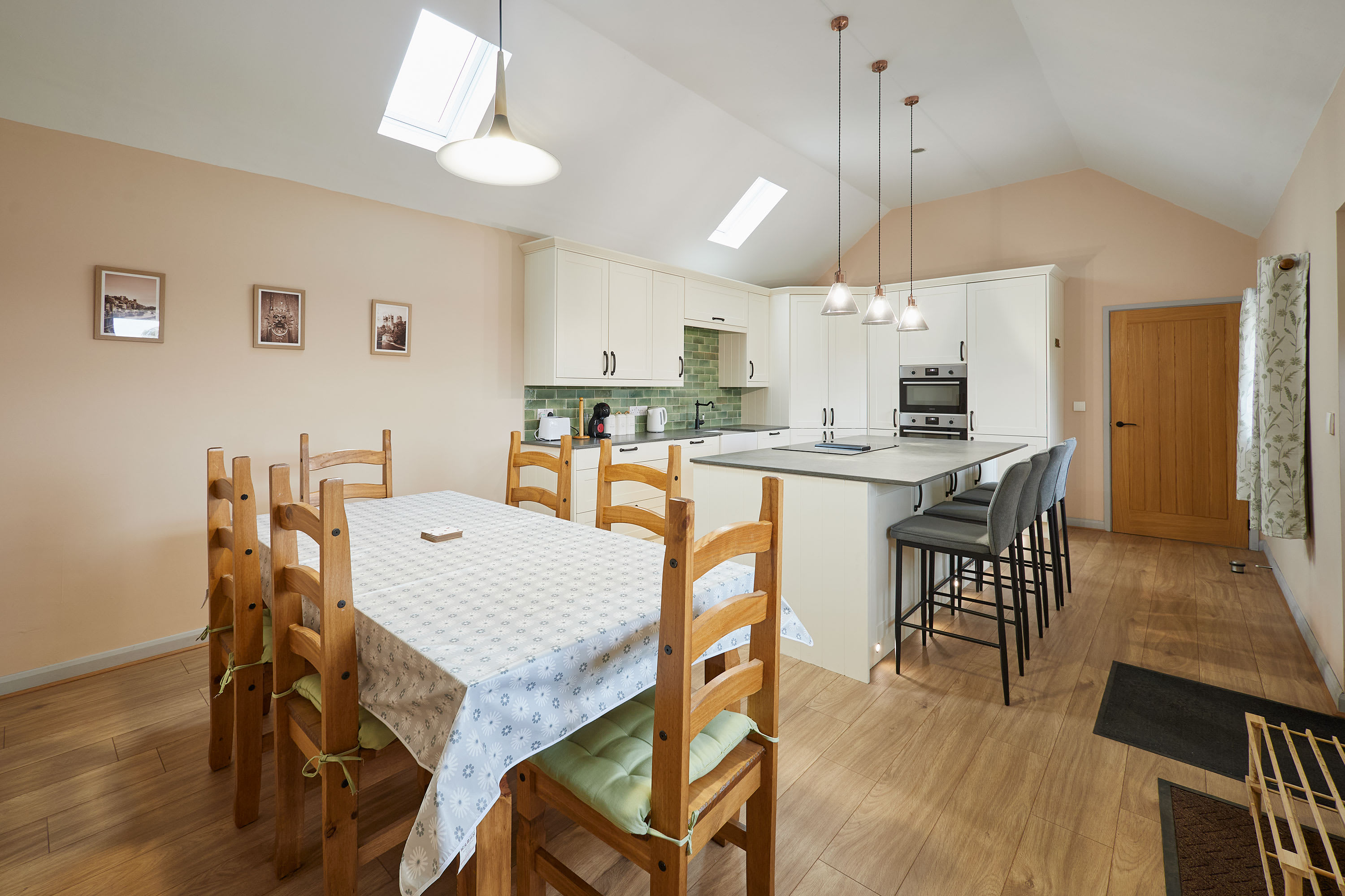 The open-plan kitchen and dining area is the heart of the home. Featuring a classic cream shaker-style kitchen, a charming Belfast sink, and a wooden dining table with matching chairs, this space is both elegant and practical. Fully equipped with everything you need for a self-catering stay, it’s perfect for leisurely breakfasts, home-cooked dinners, and memorable gatherings.