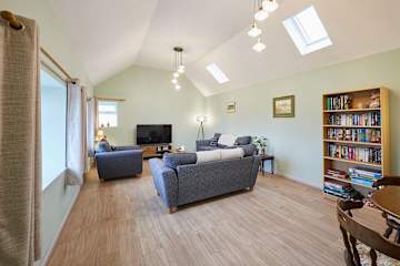 The cosy living room, with its vibrant walls and sloped ceilings, invites you to sink into the plush sofas or armchair and enjoy your favourite shows on the flat-screen TV - the ideal spot for relaxing after a day of exploring.