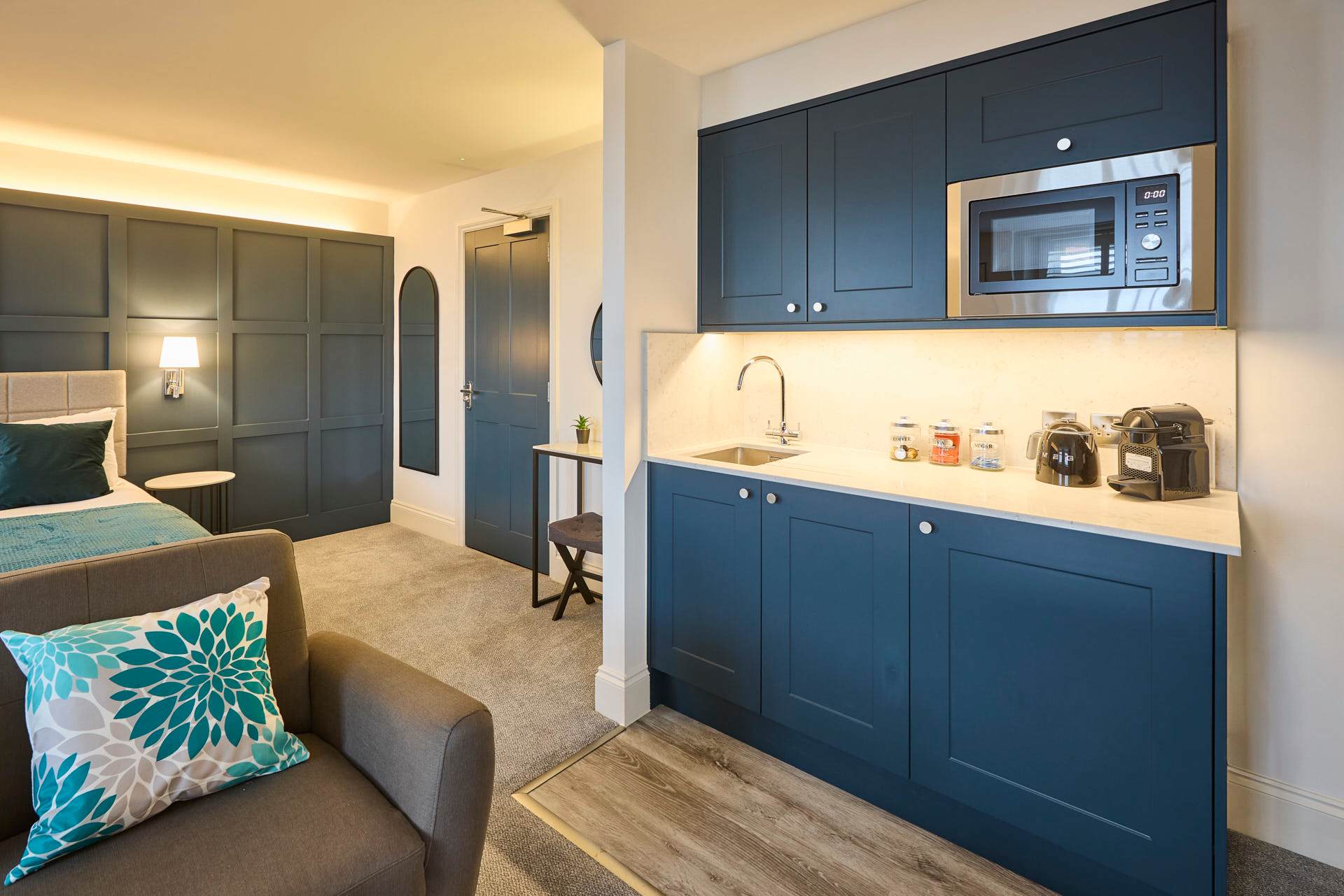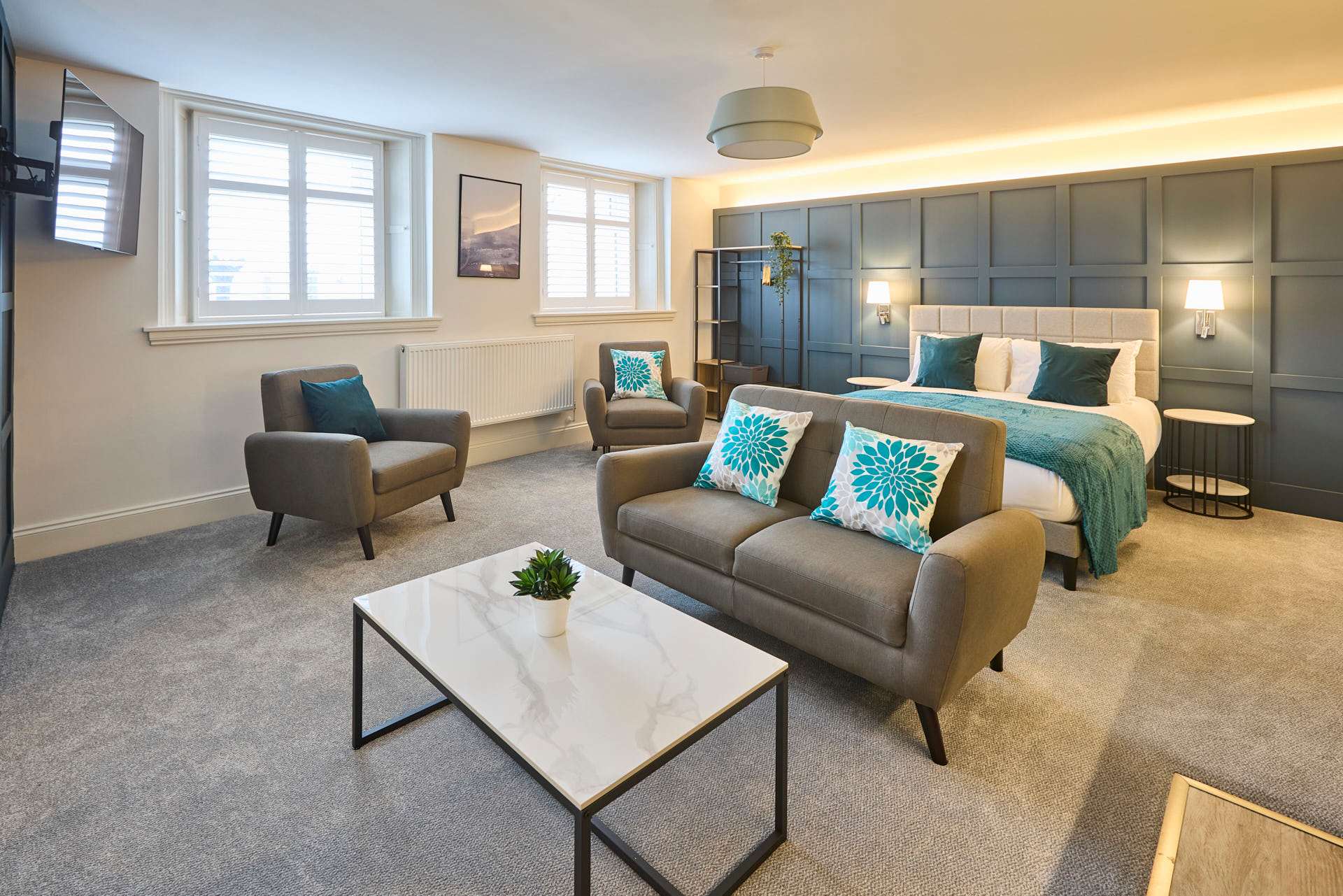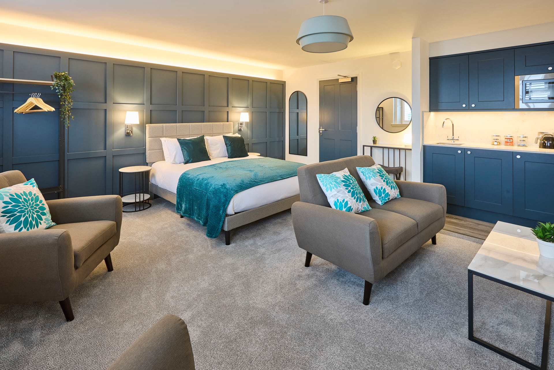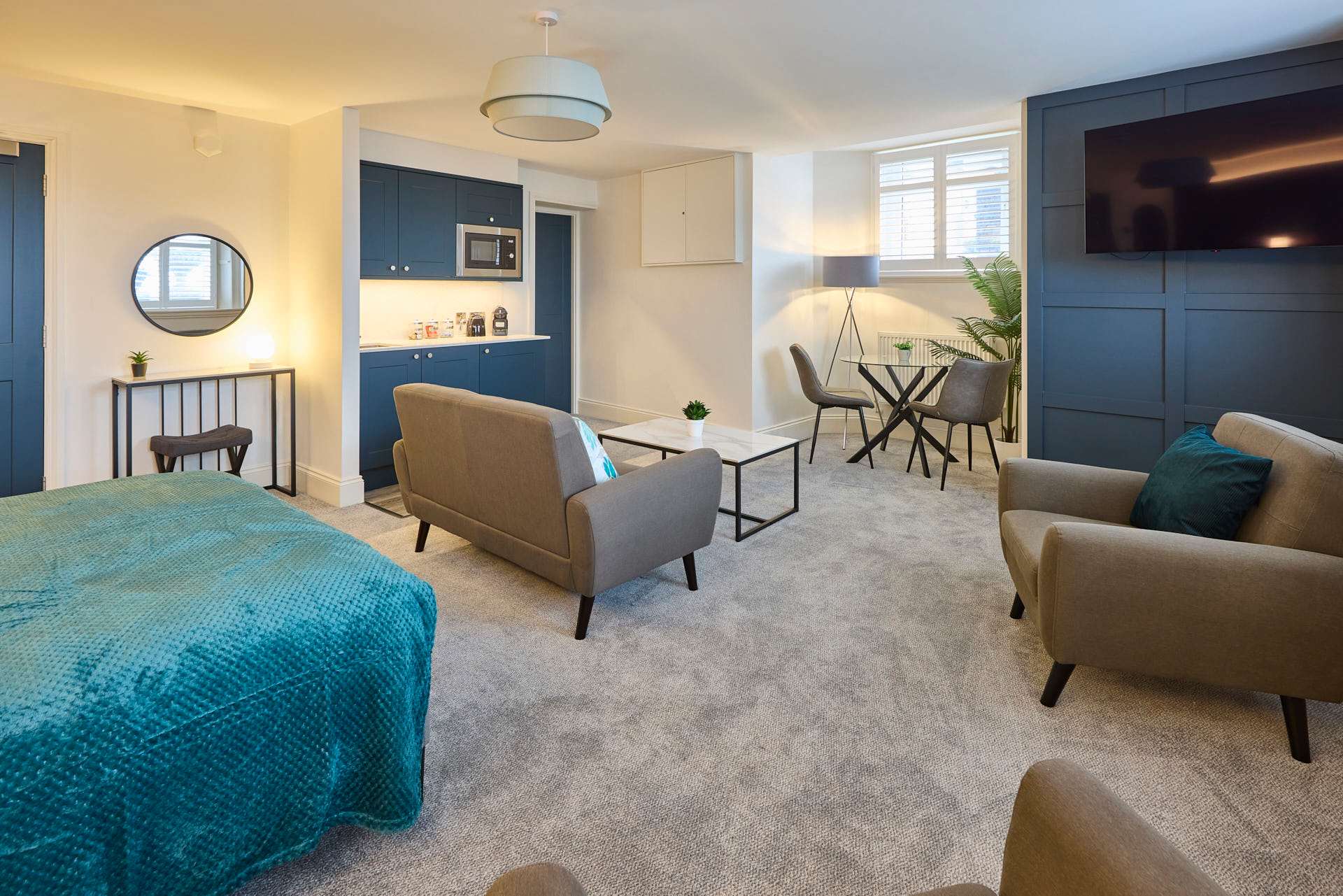 Apartment 12 at The Langley Apartments is a large, bright studio that has been newly refurbished to an exceptional standard. Surrounded by windows, the apartment is flooded with natural light, creating a fresh and airy atmosphere. Neutrally decorated throughout, it is enhanced by subtle coastal touches that bring a sense of calm and relaxation. A feature panel wall behind the bed adds character, while a wall-mounted flat-screen TV provides modern entertainment. The open-plan layout maximises space, making it perfect for unwinding after a day exploring Whitby and the local area. High-quality finishes and contemporary fixtures are evident throughout, from the sleek kitchenette equipped with modern appliances to the stylish bathroom, complete with a practical walk-in shower. Thoughtfully selected décor, inspired by the nearby coastline, adds warmth and charm without compromising the clean, modern aesthetic. Apartment 12 offers a serene and spacious retreat, combining high-standard refurbishment with timeless coastal appeal.