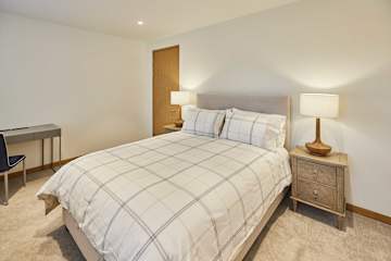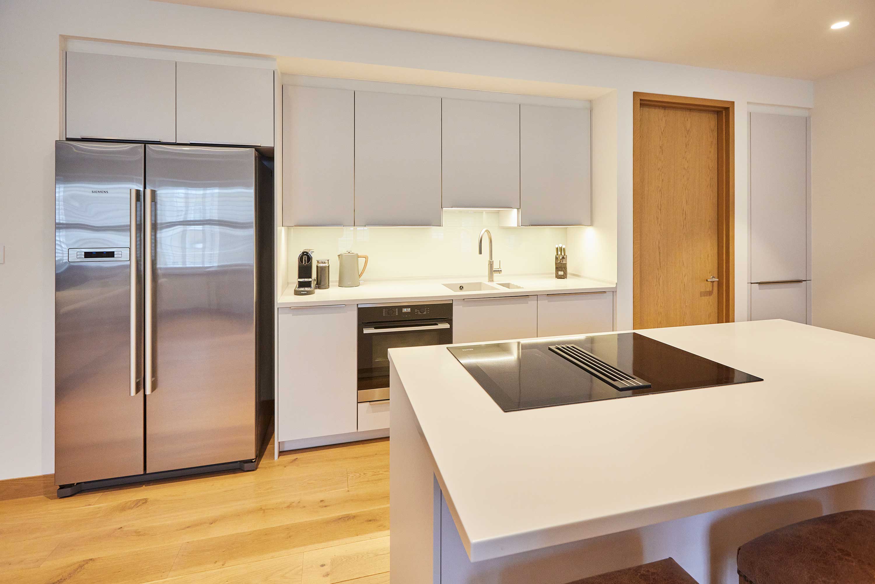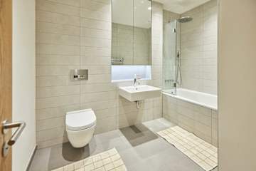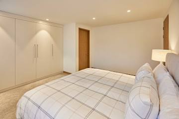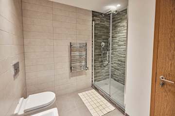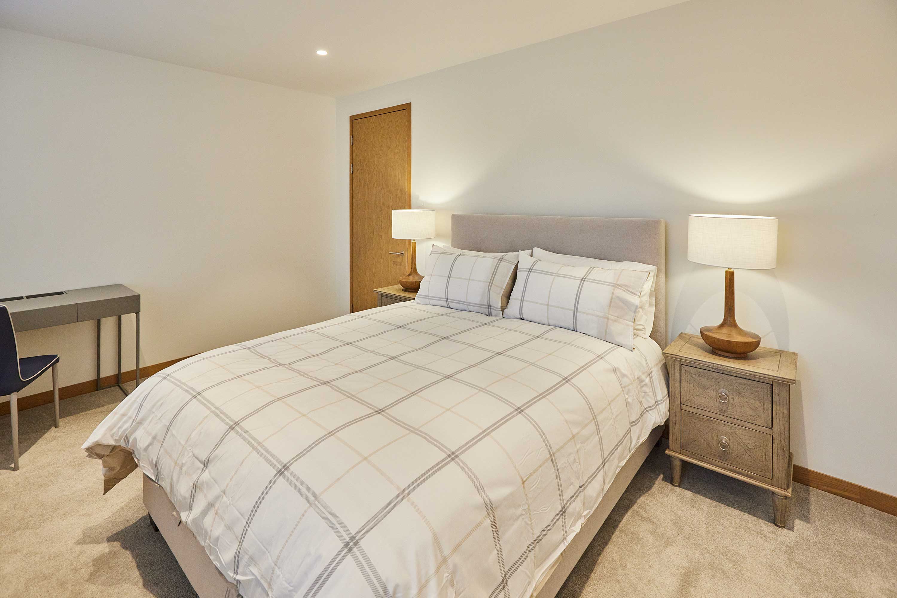 Both bedrooms have been carefully designed with relaxation in mind. The master suite boasts a luxurious super-king bed and its own private ensuite shower room, creating a calming space to retreat at the end of the day. The second bedroom offers a generous king-size bed and ample storage, making it equally comfortable for couples, friends, or family members. A second modern bathroom completes the home, with a full-sized bath and overhead rainfall shower — ideal for refreshing mornings or unwinding after a day of sightseeing.