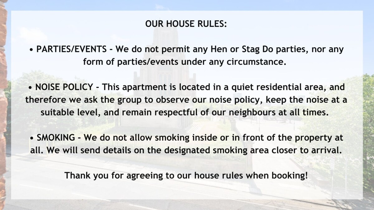 • We do not allow stag and hen nights in our property as it is in a residential building. • Any fobs which are lost during the stay will be charged at £50 per fob. • Collecting the keys before 3pm is strictly forbidden unless otherwise arranged and will be subject to a minimum charge of £20 per hour or part thereof, for the delays in cause to our cleaner’s schedule. This applies to dropping the keys back later than the check-out time of 10am. • No large groups under the age of 25. • Guests will be charged £100 if there are any signs of smoking on the property. • Please make sure to return the parking permit into the flat upon check-out. Missing of parking permit can result in a deposit charge of £100.