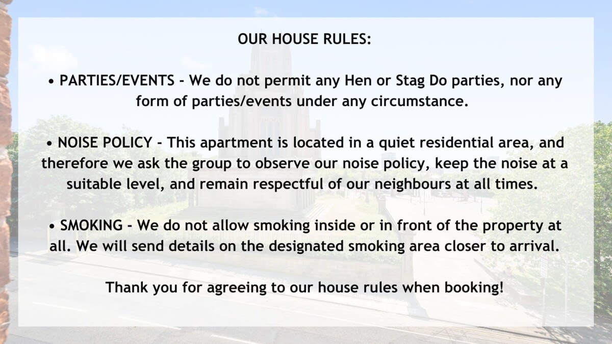 To minimise disruption to our Neighbours & Guests, we kindly ask guests to follow the following house rules: • Stag, Hen or Party Groups are not allowed in our Apartments. Please be aware you may be asked to leave if found in violation of this rule with no refund given. • Key collection is from 15:00 unless the early collection is arranged before arrival. This will be subject to availability and charged at £20 per hour. This also applies to dropping the keys back later than the check-out time of 10:00. • We are a non-smoking building. £250 will be charged if any signs of smoking are found following your stay within the flat. Please use the designated smoking area located at the back of the building and do not smoke in front of the building - Guests found doing so will be subject to a £100 charge. • Unfortunately reservations with large groups under the age of 25 will not be accepted. • Please make sure to return the parking permit into the flat upon check-out. Missing of parking permit can result in a deposit charge of £100.